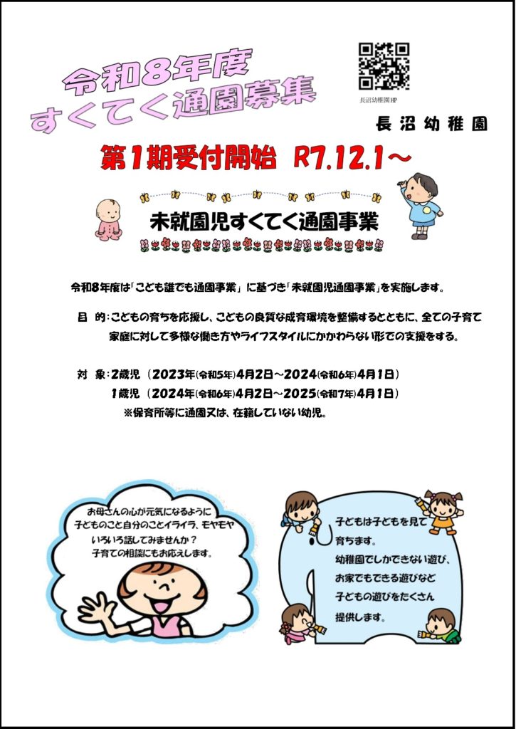 Read more →令和8年度からは「こども誰でも通園事業」に基づき「未就園児通園事業」を実施します。通園期間は保護者の方が決めることができます。令和8年度は「ひよこぐみ」1クラス、「ことりぐみ」2クラスを行ないます。最初のうちは親子参加し、段階を踏んで一人で参加していくようにします。お家ではなかなか経験できないことを経験させてあげたい、早いうちから無理なく少しずつ集団生活に慣れさせていきたい、とにかくその時間だけでも預けたいなどどんな理由でも構いません。どこか幼稚園や保育園などに入園していなければ誰でもOKです!お知らせに料金が記載してありますが、公的な補助がうけられるため実質かかりません。