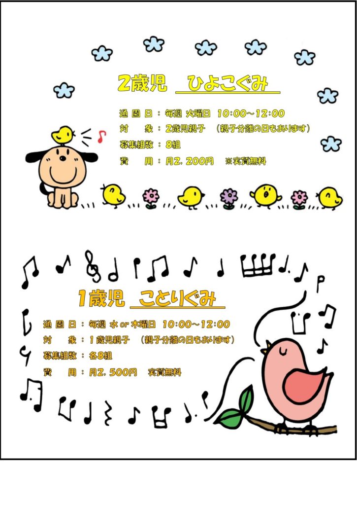 ◎「ことりぐみ」1歳児【2024(令和6年).4.2~2025(令和7年).4.1】週1回(水or木曜日)の親子一緒のクラス